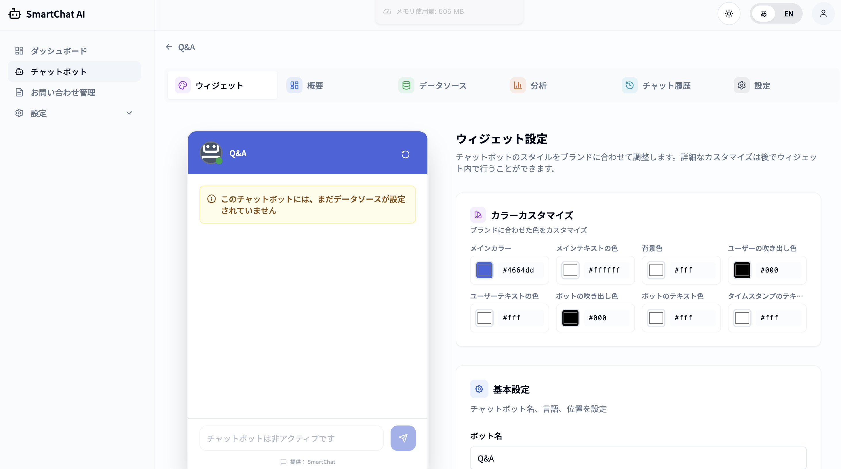 管理画面ではチャット履歴、データソース、統計レポートを一元管理でき、質問傾向や顧客満足度の可視化を通じた改善サイクル構築にも寄与します。
