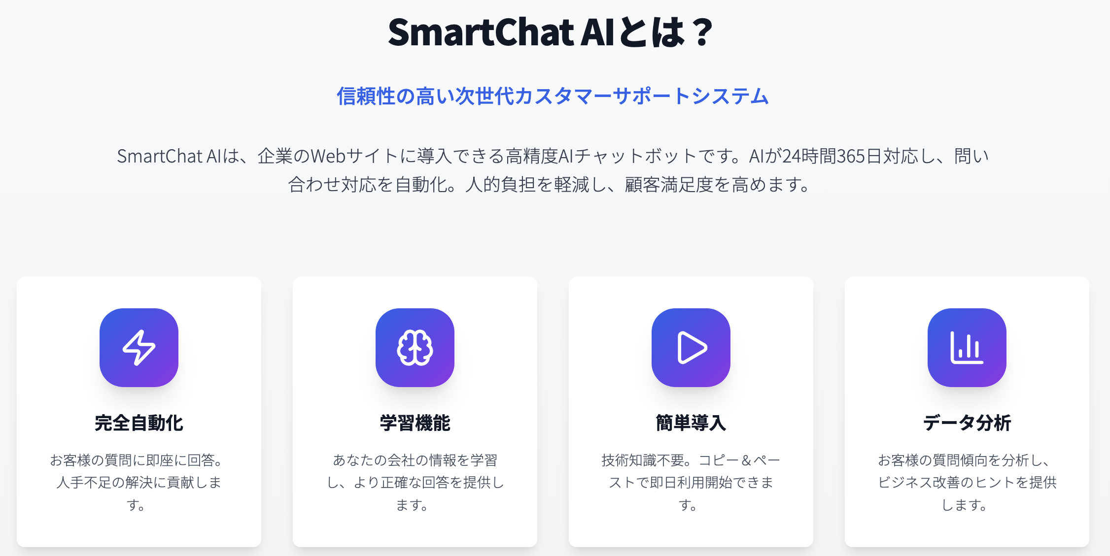 SmartChat AI は、企業の Web サイトやデジタルチャネルに導入できる次世代型 AIチャット自動応答システム です。