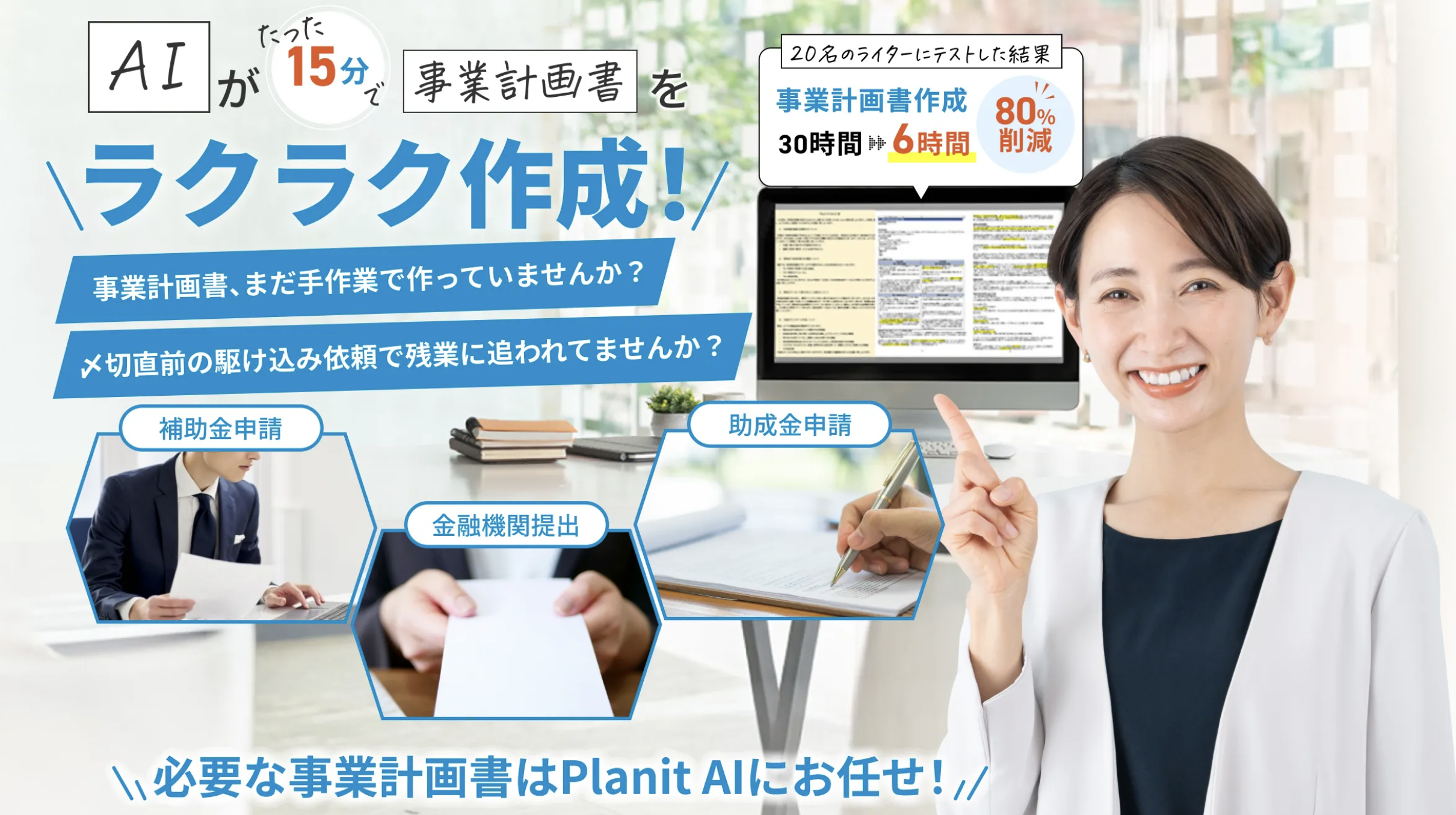 従来、手作業で数十時間を要していた計画書作成が、わずか10〜15分程度で完了する効率性が特長で、補助金申請書や創業融資用の資料作成にも活用できます。