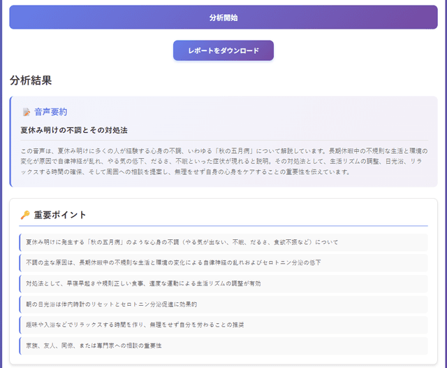 ローカルの音声ファイルだけでなく、音声URLリンクからの直接読み込みにも対応しています。Python(Flask)とモダンなフロントエンド技術を組み合わせることで、長時間の音声データから価値ある情報を抽出し、整理された読みやすい日本語のレポートを自動生成します。