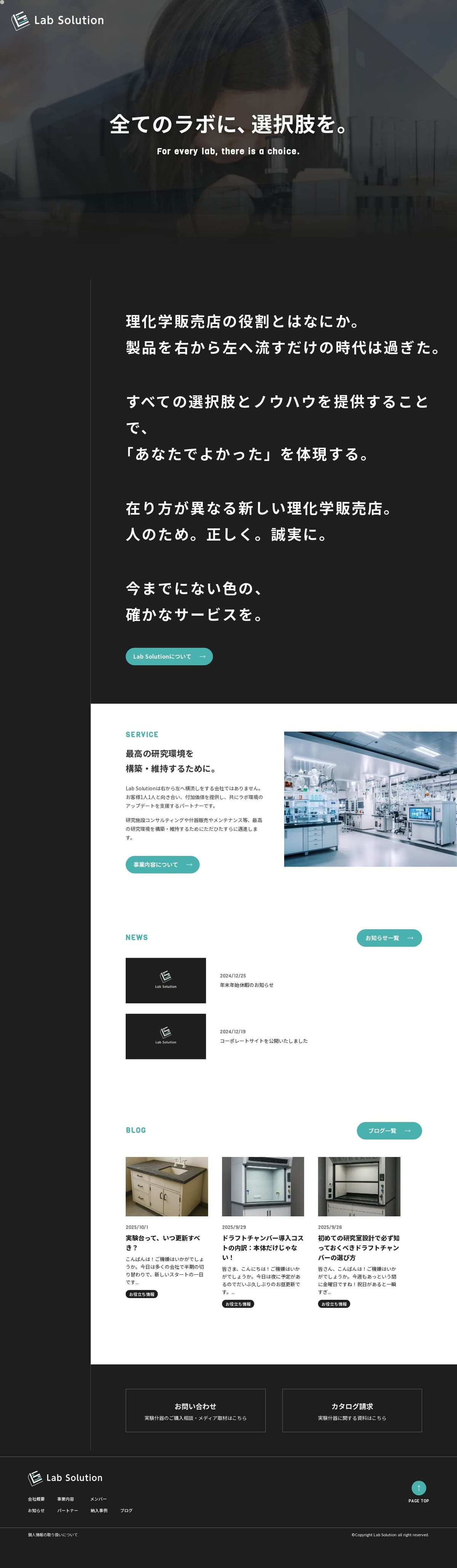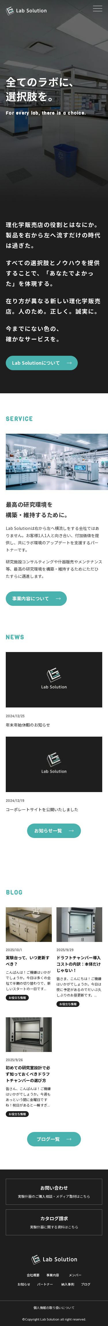 ラボソリューション株式会社様のコーポレートサイト新規制作を担当いたしました。研究施設コンサルティング、什器販売など多岐にわたる事業内容と専門ノウハウを伝えるとともに、社内の人物撮影も一括で担当し「企業の顔」となるウェブサイトを企画・制作いたしました。