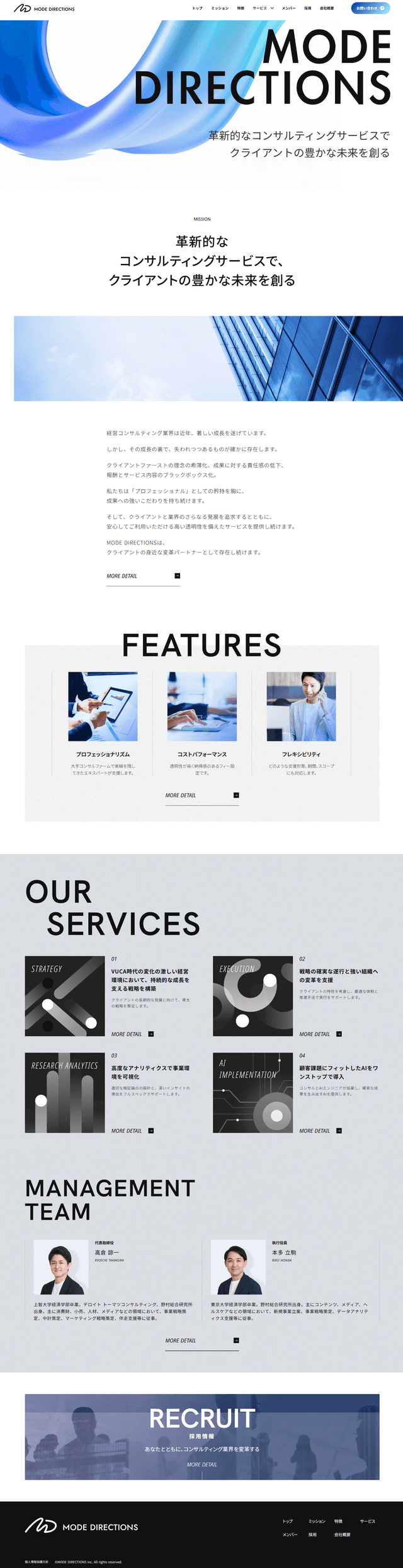 株式会社MODE DIRECTIONS様のコーポレートサイト新規制作を担当いたしました。デザインから実装(コーディング)、さらには企業のプロフェッショナリズムを伝えるための社内の人物撮影も一括で担当し、事業の魅力と専門ノウハウを伝える「企業の顔」となるウェブサイトを企画・制作いたしました。