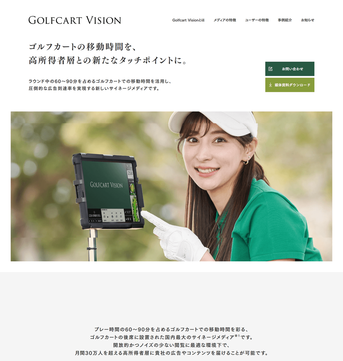 意思決定層へ直接アプローチできる日本最大級のゴルフカート設置実績を背景に、媒体の「圧倒的な訴求力」をビジュアルで表現。BtoBマーケティングにおける強力なツールとしての価値を、最新のデータと洗練されたデザインで分かりやすく提示しました。