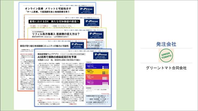 グリーントマト合同会社 石川氏:もともとフリーランスのライターとして雑誌媒体などの記事を制作しており、10年ほど前に薬局業界向け媒体に携わるようになりました。その後コロナ禍で媒体自体がなくなったことが契機となり、2020年に個人事務所(グリーントマト合同会社)を立ち上げ、医療や薬局業界のネットワークに向けて情報発信をはじめました。具体的には、ヘルスケアに関するコンテンツを執筆・編集した「P-Press」というニュースレターを、これまでに名刺交換をした業界関係者宛に月に1度メールで配信しています。Webマガジンを立ち上げるには当社は小規模すぎますし、個人的にWebで記事を読むことに苦痛を感じるということもあったので、PDF形式のニュースレターをメールで届けています。面白いなと思った方が必要に応じプリントして職場などで回覧し、読んだ方の間で何かしらの会話が生まれることをイメージしていたのも、こうした手法を採用した理由のひとつです。現在は「P-Press」での情報発信をベースとし、その取材などを通じて派生するニーズにも対応しつつ、少しずつビジネスを拡げています。