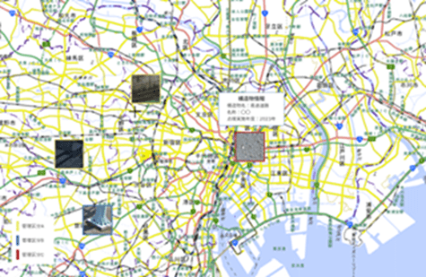 構造物を撮影した写真と位置情報を自動で紐づけ、地図上に表示。