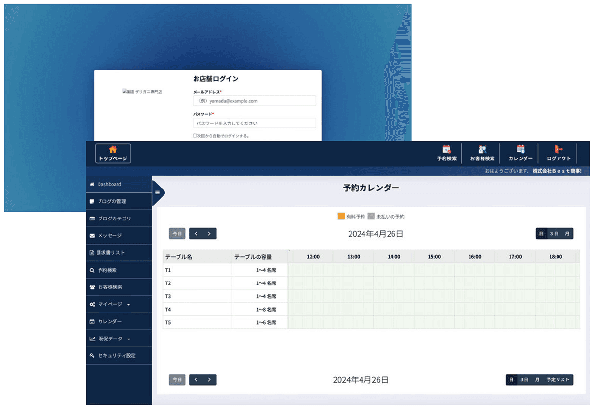 「予約倶楽部(Basic)」は、予約受付機能、決済機能、CRM機能を含む、店舗運営に欠かせない総合管理システムです。導入が容易で、すぐに利用開始が可能です。