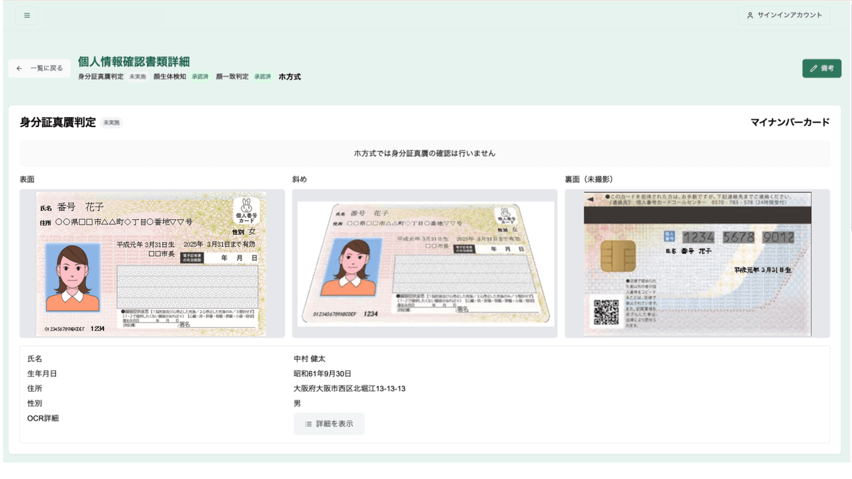 保険証・免許証・マイナンバーカードを写真で読み取る。写真をアップロードした人が実際に本人かどうかをセルフィーで生体検証を実施するアプリです。eKYC導入事業者に対してSaaSとして展開をしています。