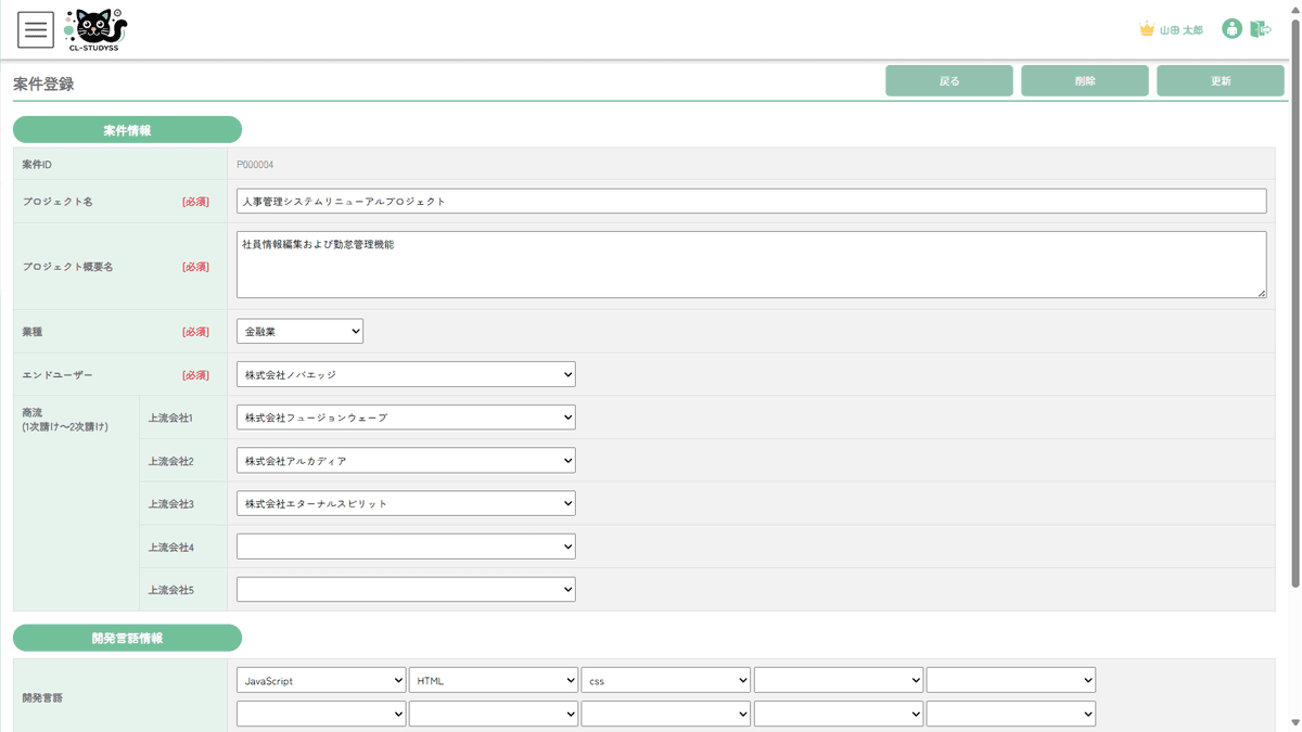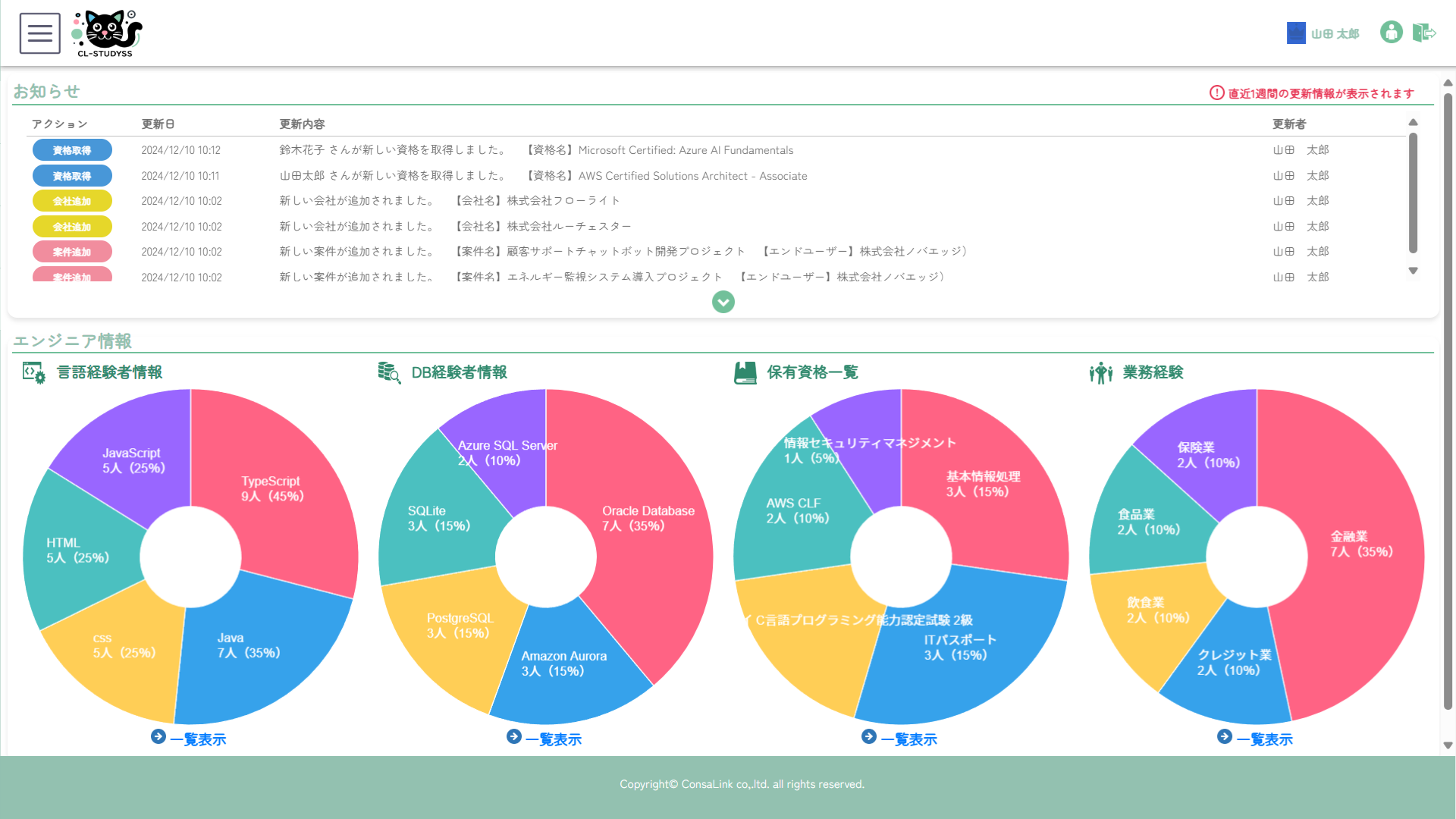 案件情報と社員の経歴情報を連携させることで、実績の蓄積や技術傾向の分析が可能になります。