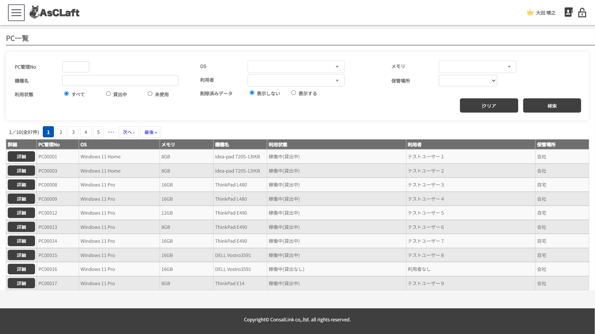 社内PCの利用者や保管場所、スペック情報を管理します。