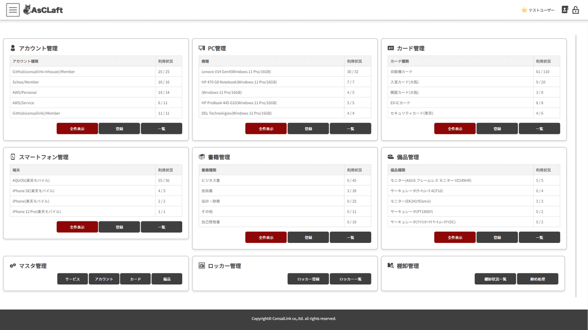 アカウント・PC・スマートフォン・カード・書籍・備品など、企業内の様々な資産の利用状況と保管場所を一元管理する資産管理システムです。